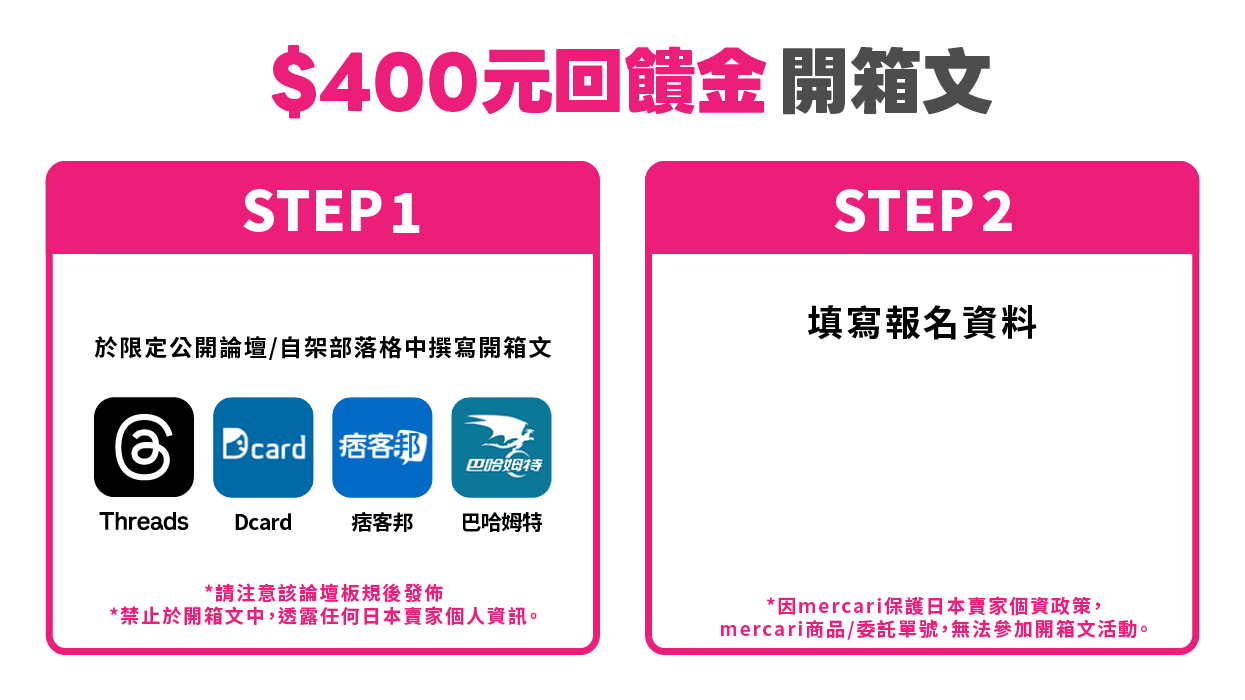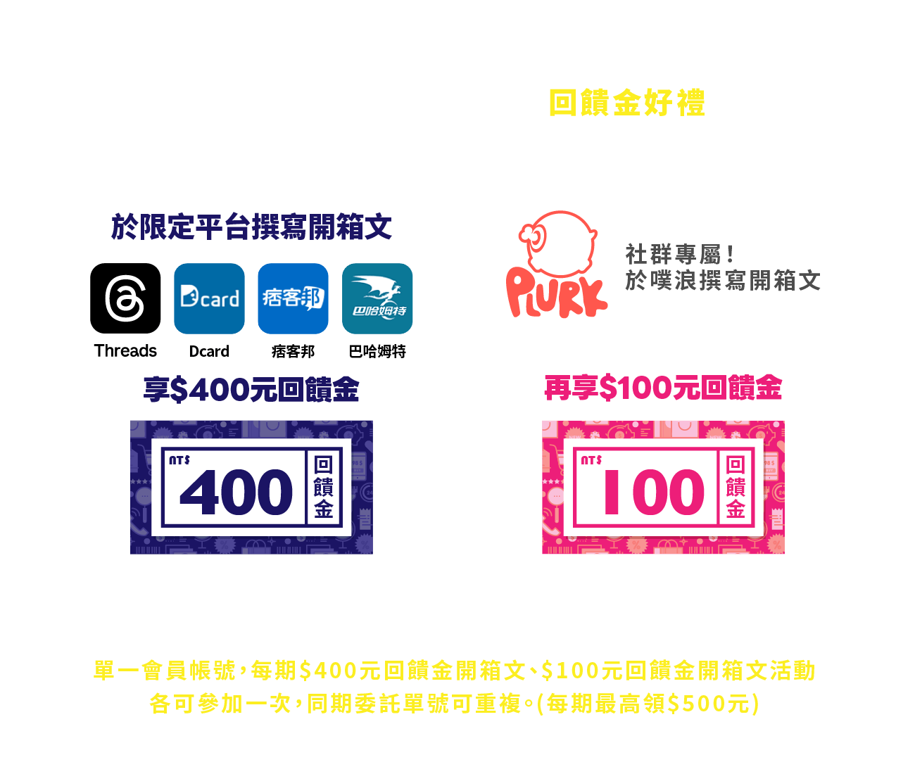$400元回饋金開箱文、$100元回饋金開箱文活動各可參加一次。