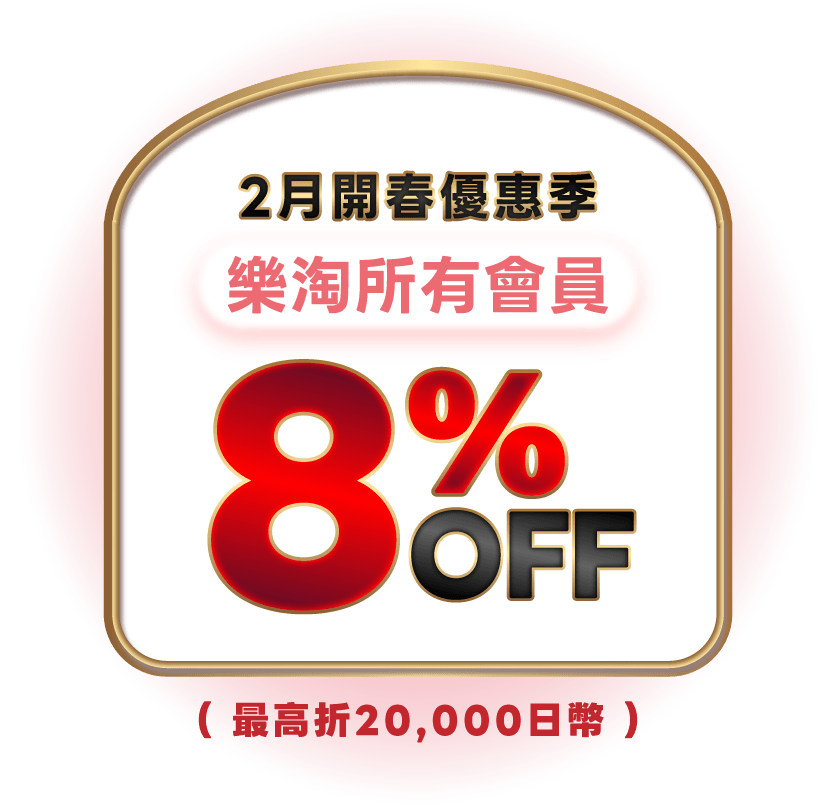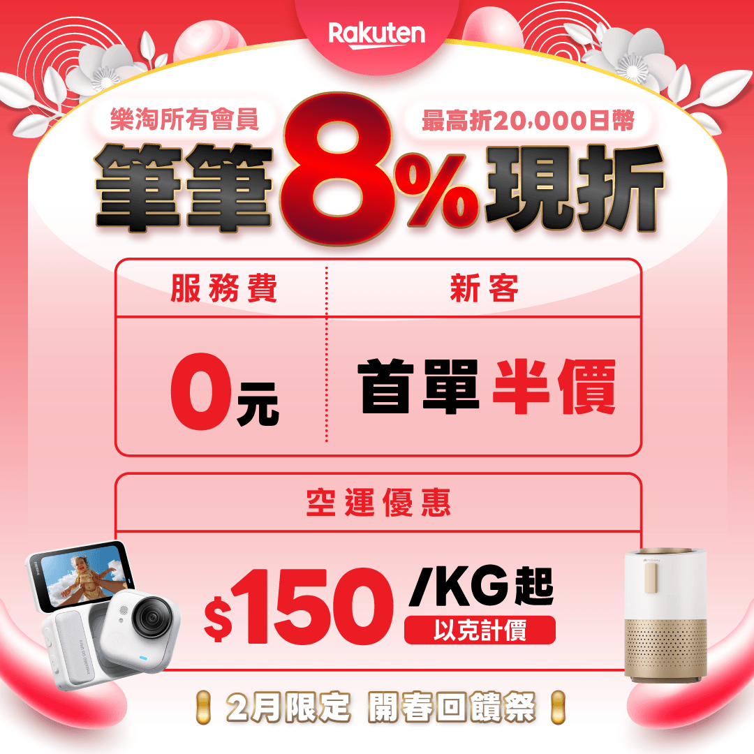 活動期間內,於「日本樂天」購買商品,不限金額8%OFF現折,上限折20,000日幣。