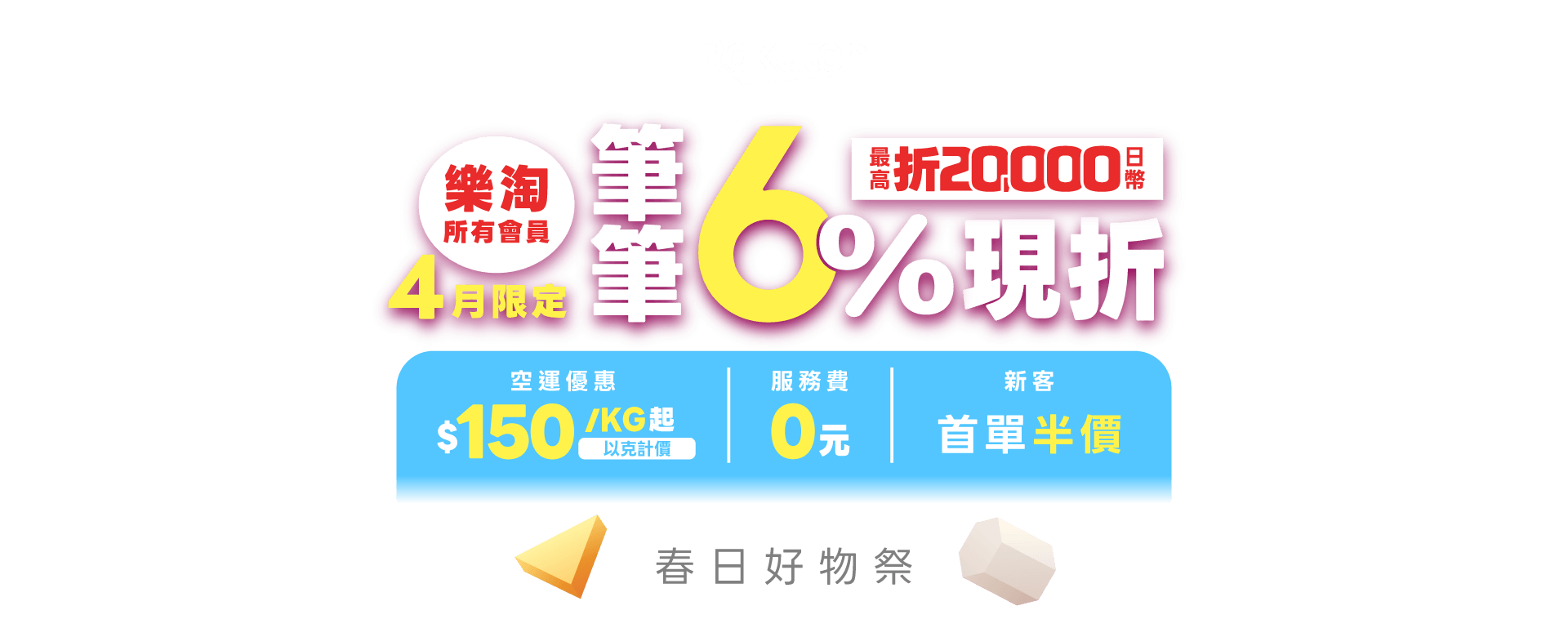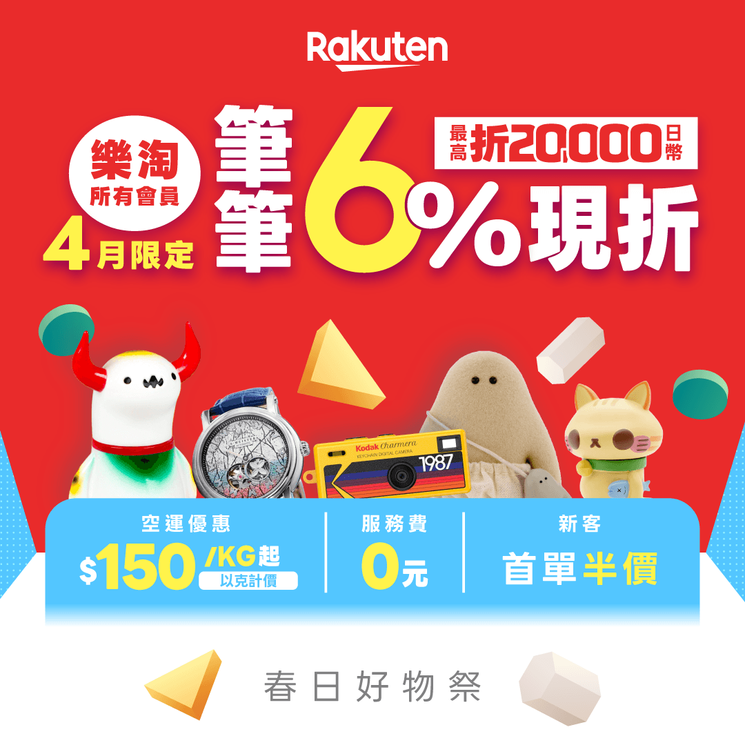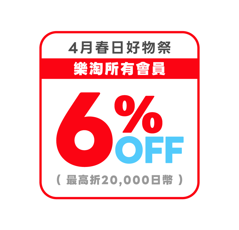 活動期間內,於「日本樂天」購買商品,不限金額6%OFF現折,上限折20,000日幣。