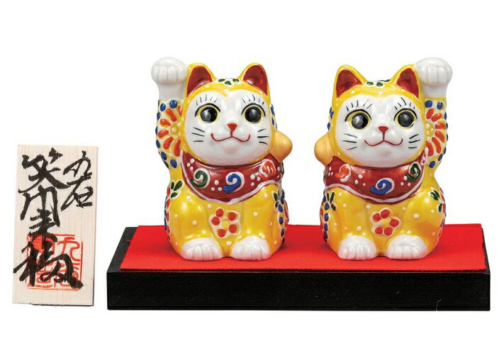 の伝統工芸品【九谷焼】2号ペア招き猫 黄盛 台・敷物・立札付