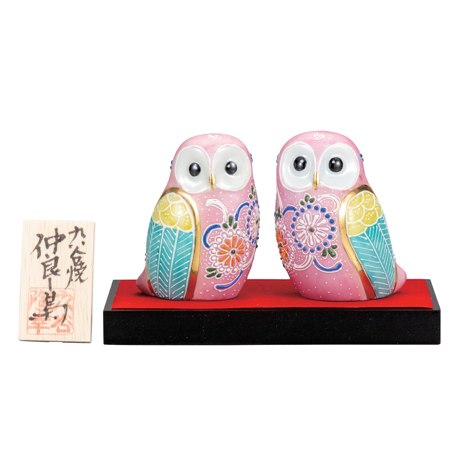 の伝統工芸品【九谷焼】2.5号ペアふくろう ピンク盛 台・敷物・立札付