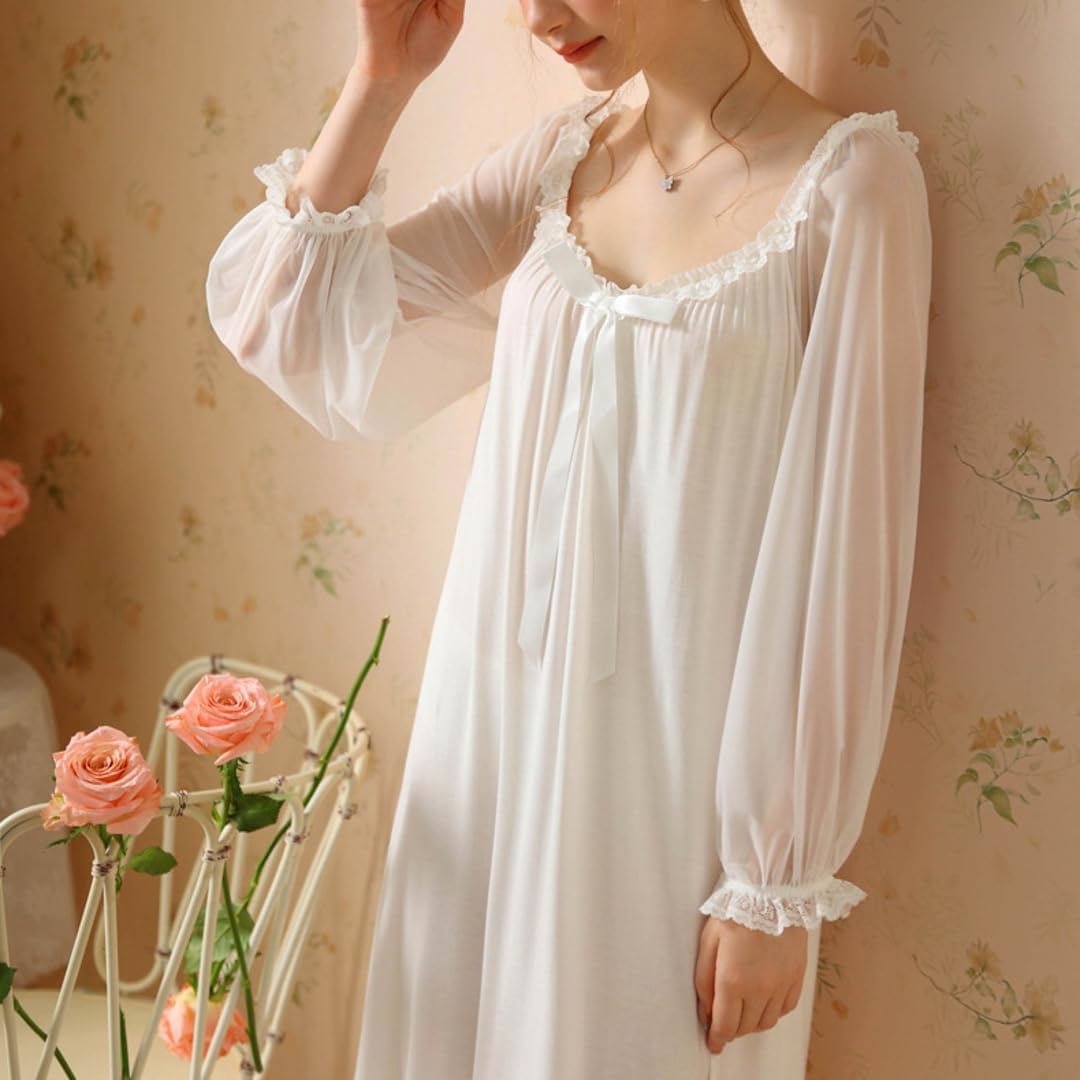 ネグリジェ ワンピースパジャマ レディースパジャマ ルームワンピース リボン付き 部屋着 長袖 ルームウェア シンプル レース 柔らかい 春 夏 秋 ゆったり お姫様気分 ロング丈
