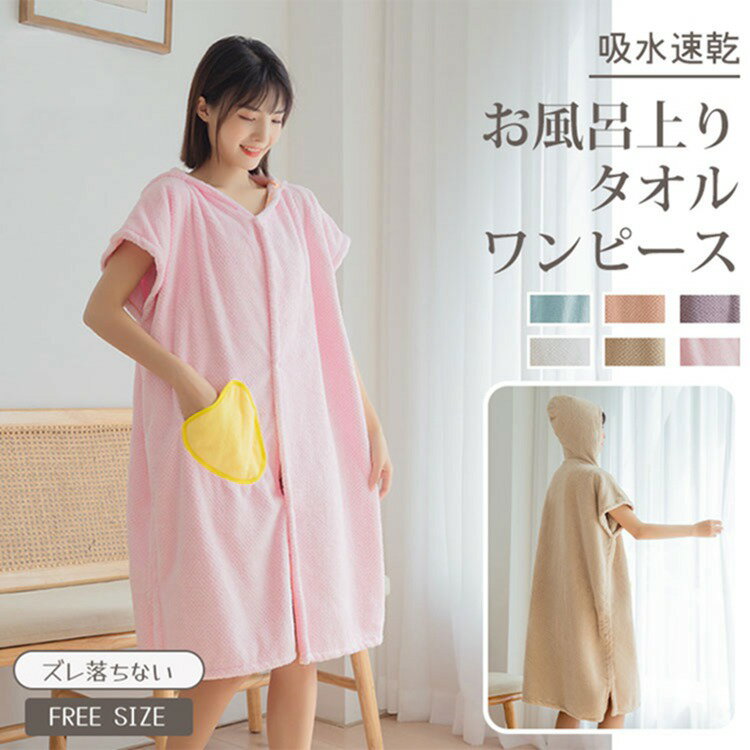 【2499円→実質2299円 8%OFFクーポン11/30まで】着るタイプのバスタオル レディース タオルワンピース タオルワンピ フード付き パジャマ 半袖 ルームウェア お風呂上がり 湯上り かわいい 妊婦 マタニティウェア 温泉 プール バスローブ マイクロファイバー 前開き