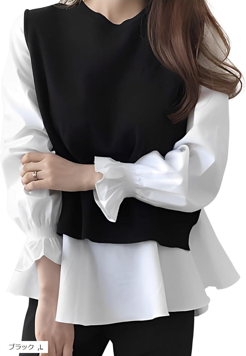 【取寄】シャツ レディース フェミニン XSサイズ Sサイズ 無地 トップス レース 丸首 ラウンドネック 長袖 透け感 夏 黒 白 ランタンスリーブ 通勤 通