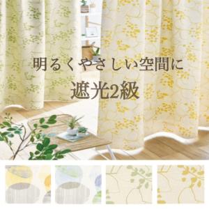 カーテン 遮光2級 洗濯OK 形態安定加工付き 北欧ナチュラル リーフ柄 グリーン イエロー 幅100×丈100〜150 送料無料