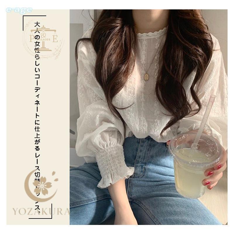 トップス ブラウス 白ブラウス シャツ レディース 無地 ランタンスリーブ レース切替 レース 春夏 夏 秋 ブラウス 長袖 袖あり 可愛い 通勤通
