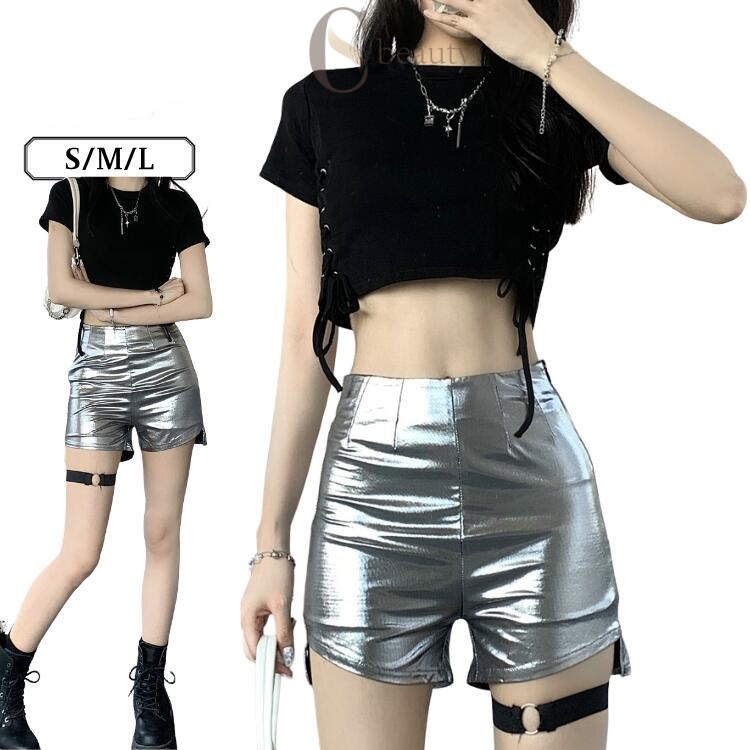 黒 メタリック シルバー 韓国 ダンス衣装 レディース トップス ショーツ レッグ飾り ヒップホップ 演出服 セットアップ おしゃれ アイドル衣装 ジャズ ダンス衣装 k-pop ステージ衣装 練習服 ストリート ダンスウェア かっこいい S M L