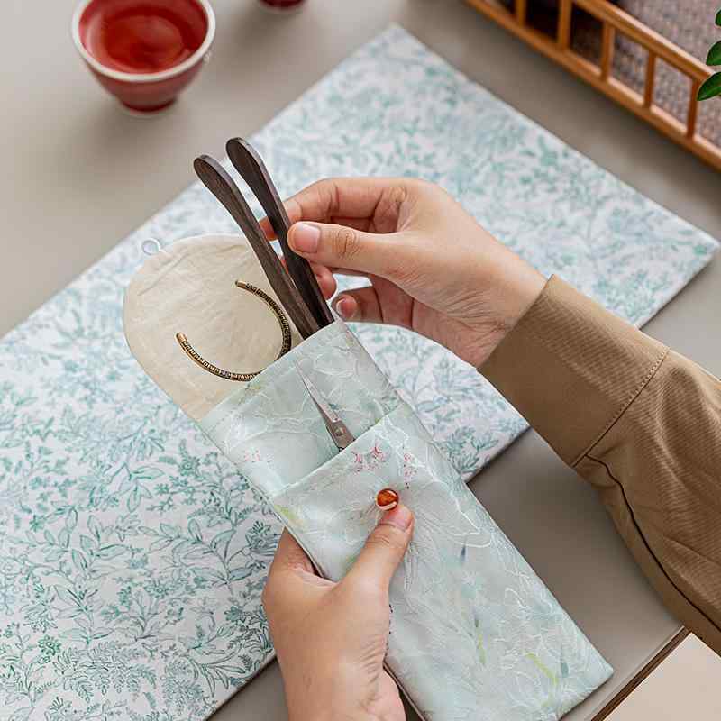 茶道具収納ポーチ 六君子 茶器 お茶用品 布製 ファブリック 携帯 トラベル 旅行用 コンパクト 多機能 中華風デザイン 茶挟み 茶鋏 筆記用具入れ