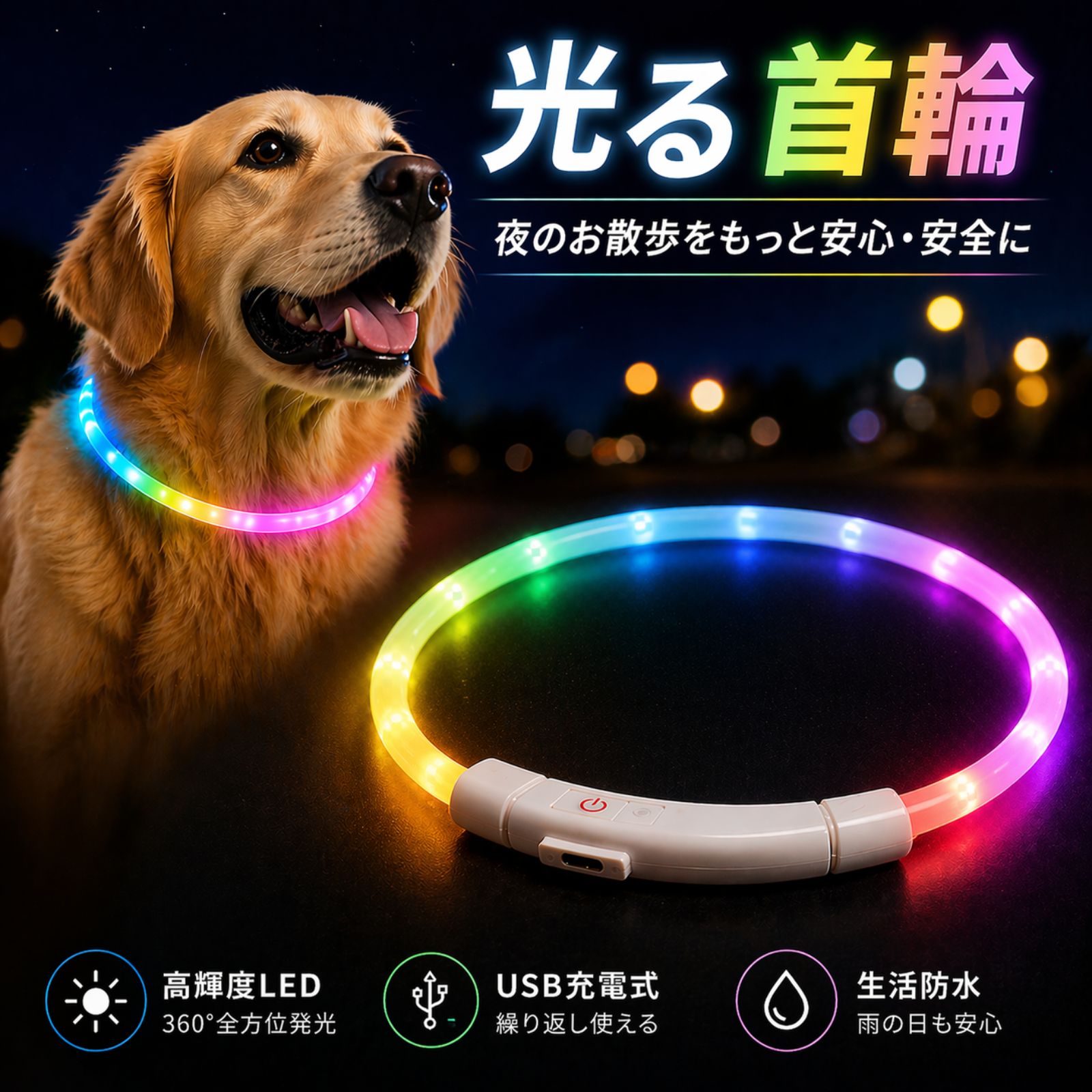 光る首輪 犬 散歩 ライト レインボー LED 充電式 Type-C シリコン 事故防止 安全 視認性 サイズ調整可能 ペット用品 首輪 バックル 脱落防止 丈夫 軽量 柔らかい 360度発光 3モード 防水 おしゃれ かわいい 猫 小型犬 中型犬 大型犬 全犬種対応 散歩用ライト 夜道