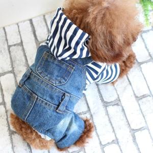 犬用 猫用 服 デニム生地 ストライプ柄 S M L お散歩グッズ ペット つなぎ フード付き ドッグウェア ドッグウエア ペット用品 かわいい 送料込み