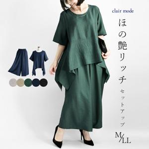 【送料無料】 ほの艶リッチセットアップ 5色 M-LL 洗える レディース トップス オーバーブラウス パンツ フォーマル セットアップ 2点セット アンサンブル 春夏