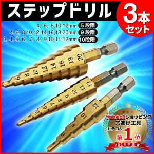 ステップドリル タケノコドリル チタンコーティング 六角軸 3本セット(4-20 4-12 3-12) HSS鋼 穴あけチタン 収納袋付 ミリ(mm)