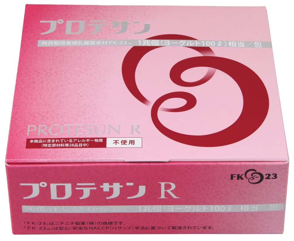 1包(1.2g)当り1兆個(ヨーグルト換算100L)相当のFK-23乳酸菌を含有した乳酸菌サプリメントです。オリゴ糖も配合し、食物アレルゲンフリーの原材料のみを使用したヘルシーな食品です。プロテサンR62は、常温で手軽に持ち運びできる個包装タイプです。飲み易いソフト顆粒状ですので、いつでもどこでも手軽に多量の乳酸菌を摂取できます。※当商品は、乳酸菌「エンテロコッカス・フェカリス FK-23菌」を加熱処理した乳酸球菌含有サプリメントです。。※当商品は、FK-23乳酸菌を加熱処理した乳酸球菌含有食品です。