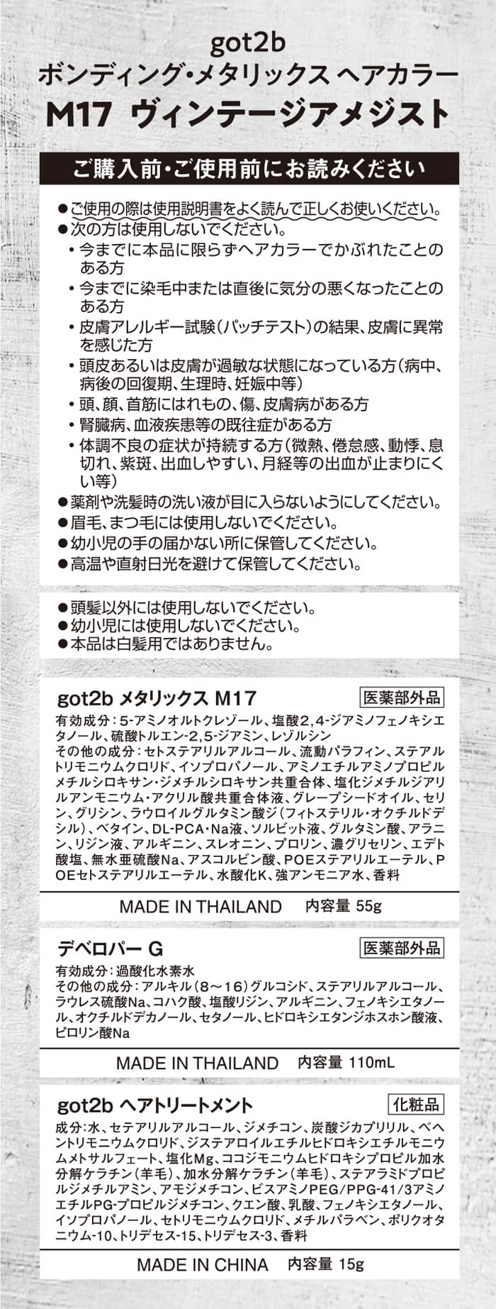 ボンディング・ブリーチ(毛髪保護成分「コハク酸」が毛髪内部まで浸透、ハイトーンなのになめらかな仕上がりへ。)ボンディング・トリートメント(毛髪保護・補修成分「塩化Mg」配合。毛髪内部に直接働きかけ、切れにくいブリーチ髪へ。)暗い髪の方は、got2bボンディング・ブリーチ等で、事前に明るくしておくのがおすすめ!キレイな発色の秘密(サロン発のカラーテクノロジーを搭載。アミノ酸系油剤が染料と保湿成分を包み込み髪の芯まで届けるので、キレイにしっかり発色しながら潤いに満ちたやわらかさを感じる仕上がりへ。)