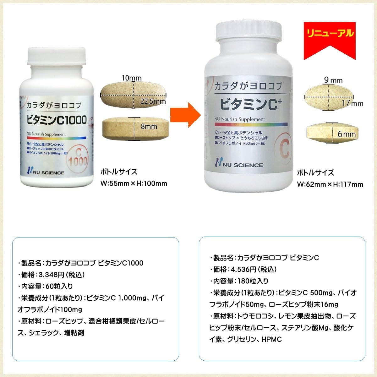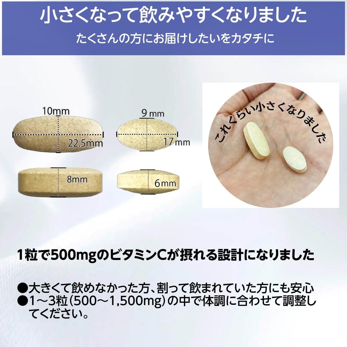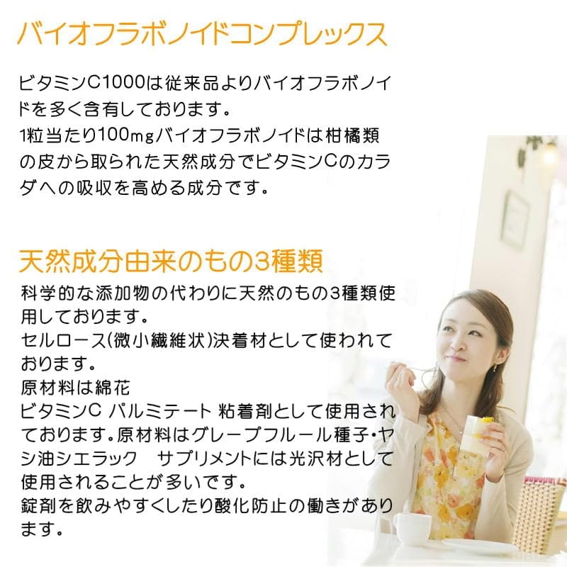 【タイムリリース加工】 タイムリリース加工とはサプリメントが体に入った後、徐々に溶けるようにする加工で、体内に溜める事ができない水溶性ビタミンを徐々に吸収することで体内濃度を高く維持する加工です。【バイオフラボノイド配合】 ビタミンCはバイオフラボノイドを1粒あたり50mg含有しております。バイオフラボノイドはレモンの皮から取られた天然成分で、ビタミンCの体への吸収を高める成分です。【栄養表示】3粒(2.46g)当たり エネルギー 10kcal タンパク質 0g 脂質 0.1g 炭水化物 2g 食塩相当量 0.002g ビタミンC 1,500mg、レモンバイオフラボノイド 150mg、ローズヒップ粉末 50mg 大きくて飲めなかった方、割って飲まれていた方にも安心。 1~3粒(500~1,500mg)の中で体調やご年齢に合わせて飲用量が調整できます。