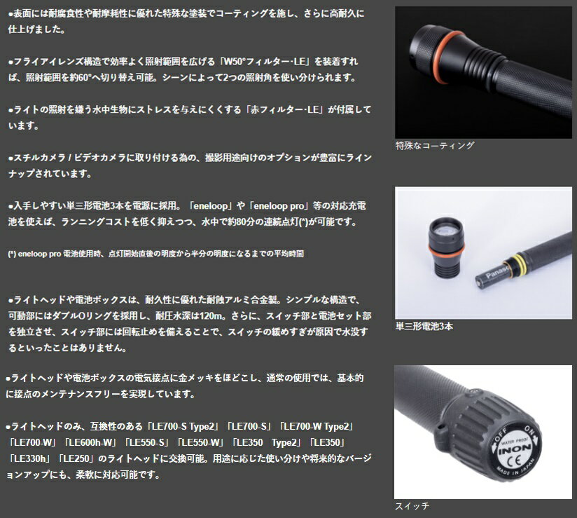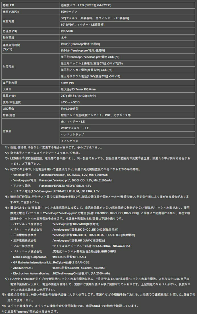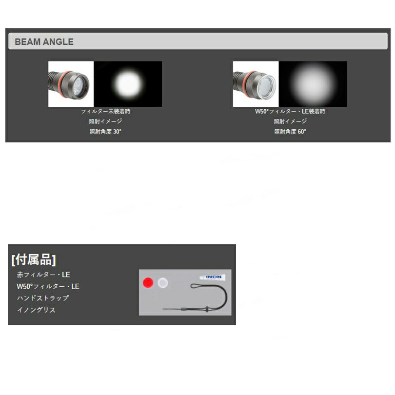 【レターパックサービスご利用上の注意事項】 ※購入前に必ずご確認ください。 ■商品の出荷後に追跡番号をご案内いたします。お荷物の到着まで安心してお待ちいただけます。 ■商品は玄関先手渡しとなります。 ※商品の紛失・未着・盗難・破損・遅延した場合の責任は負いかねます。商品代金並びに送料や手数料の返金、及び交換・返品対応は一切出来ません。 ※宅配BOXなど一時保管スペースへの配達は行っておりません。 ※ご不在の場合は、不在表が投函されますので、お客様自身で再配達のお手続きをお願いいたします。 ■代金引換はご利用できません。クレジットカード決済または、銀行振込・コンビニ決済その他前払い決済をご利用ください。 ※コンビニ決済、銀行振込時に発生する(振込)手数料はお客様ご負担となります。 ※代金引換でご購入された場合、自動的にご注文をキャンセルとさせていただきます。 ■当該商品以外の商品を同時に購入された場合は、その組み合わせやサイズ、ご購入数量により、宅配便に変更、もしくはご注文自体をお断りする場合がございます。 ※送料が発生する商品との複数購入は当ショップ規定の送料ルールが適用されます。 ■レターパック発送商品は、キャンセル・返品・交換を一切お断りさせて頂いております。 ※長期不在・受取拒否等により商品が当ショップに返送された場合、往復の送料(当社実費負担分)をご請求させていただきます。 ※不在表が投函されていなかったという理由による返金や代替品の発送は行っておりません。お客様自身で管轄郵便局と解決を図って下さい。 ■配達日時のご指定は出来ません。 ■返品・交換不可商品となります。 ■商品の梱包は簡易包装となります。 ※商品の種類により緩衝材などを使用しないで出荷させて頂く場合もございます。 ※販売価格維持の為、商品本体をパッケージから出して出荷させていただく場合もございます。(パッケージは同梱させていただきます。) ■商品の未着や破損、送料の補償をご希望される場合は宅配便をご利用ください。 ※レターパックでの配送サービスをご利用されるお客様におかれましては、上記注意事項をご理解、ご承諾いただいたものとして、商品を出荷させていただきます。 ■INON(イノン) LE600h-W 水中LEDライト 防水ライト 高演色・高色温度LEDチップ搭載 広角撮影をカバーする、ワイドビームハンディー水中ライト 最大光量600ルーメン、照射角はワイドな75度。 主に撮影用ライトとして使いやすい光量と照射角を備えます。 高演色LEDチップを搭載したことで、被写体の色再現性、視認性が向上し、少し広めな75度の範囲を均一に照らす強力な光線は、マクロ、ワイドマクロ撮影に最適です。 洞窟やナイトダイビングで広範囲を照らすダイビングライトとしても威力を発揮します! ●イノンhシリーズライトの色再現性が高い高演色・高色温度LEDチップを新たに搭載し、演色性はRa90。 色温度は6500K。フォーカスライトやマクロ撮影の光源として、最適な光質を生み出します。 ●色温度を高くしたことでストロボ光に近い色合いを実現し、ストロボ撮影時のターゲットライトとして使用しても、ライトの色味の違和感なく撮影が可能です。 ■付属品 赤フィルター・LE ハンドストラップ イノングリス ■動作環境:水中 ■実用耐水深:120m ■大きさ:最大径33.7mm x 193.6mm ■重量 [陸上/水中](*10):217.5g / 約131g ■使用/保管温度:+-0°C 〜 +30°C ■LED寿命:約10000時間 ■材質/処理:耐蝕アルミ合金 / 硬質アルマイト、PBT、光学ガラス等 [検索文言] INON / イノン / 水中ライト / ダイビング / スノーケリング / LEDライト / 600ルーメン / マリンスポーツ / ナイトダイビング / 水陸両用ライト /