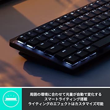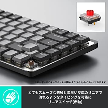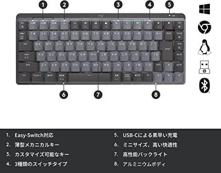 特殊:B0B1Q6H9X5コード:4943765058274ブランド:Logicool(ロジクール)商品カラー: グラファイト商品サイズ: 高さ2.6、幅31.3、奥行き13.2商品重量:612この商品について独自のロー プロファイルキーを採用した静かな打鍵感のワイヤレスメカニカルキーボード テンキーレスモデル 赤軸(リニア)KX850CL リニアスイッチ(赤軸) とてもスムーズな感触、素早い反応のリニアで流れるようなタイピングを可能に高さが低い独自のロー プロファイル キーを採用 手首をあまり曲げなくて済む 3.2mmの短いキーストロークでタイピングの際の指の負荷が比較的小さいスマートライティングを搭載 周囲の環境に合わせて光量が自動で変化 ライティングのエフェクトをカスタマイズ可能Bluetooth Logi boltで接続 Unifying非対応キーボードの説明メカニカル接続技術BluetoothブランドLogicool(ロジクール)シリーズMECHANICAL MINI色グラファイトキーの数88商品寸法 (長さx幅x高さ)13.2 x 31.3 x 2.6 cmスイッチタイプリニア表示を増やす発送サイズ: 高さ5.4、幅15.1、奥行き33.8発送重量:860独自のロー プロファイルキーを採用した静かな打鍵感のワイヤレスメカニカルキーボード/テンキーレスモデルが登場 リニアスイッチ(赤軸)を採用したこのスタイリッシュなミニマリストサイズの薄型ワイヤレスメカニカルキーボード(KX850CL)はとてもスムーズな感触、素早い反応のリニアで流れるようなタイピングを可能に。メカニカルキーボードならではの打鍵感とタイピング時の静かさを兼ねそろえています。キーには高さが低い独自のロー プロファイル キーを採用。手首をあまり曲げなくて済むこと、また3.2mmの短いキーストロークでタイピングの際の指の負荷が比較的小さく、長時間の作業でも疲れにくくなっています。ボディにはスマートライティングを搭載。周囲の環境に合わせて光量が自動で変化するこのライティング機能は手を近づけると点灯、離席すると消灯するスマートイルミネーションが起動します。また、Logi Options+( 1)を使えば、ライティングのエフェクトをカスタマイズすることも可能( 2)。6つのバックライトモードを切り替え、様 なライティングスタイルをお楽しみいただけます。ロジクール独自のEASY-Switchに対応。EASY-Switch対応の3台までのデバイスを、キー操作のみで操作端末を簡単に切り替えられます。接続はBluetooth、Logi bolt( 3)に対応。「Logi Bolt」はグローバルスタンダードに基づいた安全でクローズドな接続を実現し、対応デバイス6台に1つのUSBで接続可能なため、USBポートを有効活用することができます。(接続距離:10m)。Unifying非対応。環境に配慮し、製品本体のプラスチック部分に再生プラスチックを使用( 4)。また森林保全活動を支援するため、パッケージにFSC認証を取得した森林に由来する材料を採用しています。USB-C-A充電式。フル充電で最大15日間、またはバックライトをオフにして最大10か月間の使用が可能です。(週5日 1日8時間の使用に基づく)。メーカー保証2年間。キーピッチ 19mm、キーストローク 3.2mm、押下圧55g( 1) Logi Options+はロジクールオフィシャルホームページで無料でダウンロード可能です。従来のLogi Options+をこれまでご利用のお客様は一度アンインストールの上、最新版のLogi Options+のダウンロードをお願いします。( 2) 6つのバックライトモードの切り替えには最新版のLogi Options+のダウンロードが必要です。Logi Options+をインストールいただくと、ファンクションキーのライトマークが機能し、Fnキーを押しながらライトマークを押すことで6つのバックライトモードを切り替えることができます。( 3) Logi boltでの接続には専用のUSB-Aレシーバーが必要となり、本製品には同梱されています。( 4) 再生プラスチックの使用率はMX MECHANICALが45%、MX MECHANICAL MINIが47%です。対応OS: Logi Bolt Windows 10、11以降 macOS 10.15以降 Chrome OS Bluetooth Windows 10、11以降 macOS 10.15以降 Chrome OS、Android