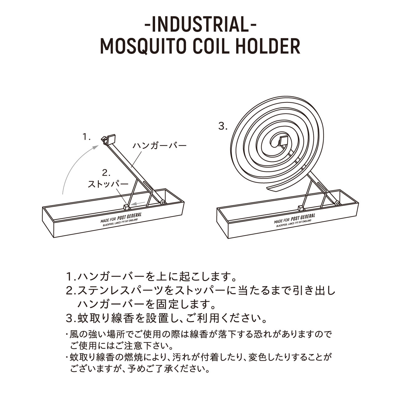 【POST GENERAL ISSUE010】カタログシリーズはコチラ 【商品名】 インダストリアル モスキートコイルホルダー POST GENERAL 【品番】 982350001 【JANコード】 4589939998948 【商品管理番号】 1001503 【生産地】 インド 【サイズ】 約w170×d40×h20mm 容量:約115g 【素材】 スチール、コットン 【注意事項】 ・強い力を加えると変形する事があります。 ・ハンドメイド製品の風合いを活かした商品のため刻印のムラなどがあります。予めご了承ください。 ・濡れたまま放置すると錆の原因となります。 ・風の強い場所でのご使用の際は線香が落下する恐れがありますのでご使用にはご注意ください。 【商品説明】 素材を活かして無骨な雰囲気に仕上げた蚊取り線香ホルダー。 手軽に持ち運びできる折り畳み式です。 人気のブラス(真鍮)モスキートコイルホルダーをインダストリアルシリーズ仕様で作りました。 鉄の風合いを活かしたメッキ加工仕上げが醸し出す素材感が特徴です。 使わない時はアームを畳み収納できる構造で、アウトドアシーンでの持ち運びに便利。 収納・持ち運びに便利な専用バッグ付き。 同シリーズで、仕様前の蚊取り線香を収納・持ち運びできるモスキートコイルボックスもあります。 無骨な雰囲気がインテリアのアクセントにもなる、夏にかかせないアイテムです。 インダストリアル モスキートコイルホルダー 982350001 w170×d40×h20mm POST GENERAL ISSUE010 日用品雑貨 虫よけグッズ 生活雑貨 アウトドア 広告文責 (有)パルス 048-551-7965 「出荷の予定ですが万が一欠品やメーカー終了の場合は別途メールにてご連絡いたします」『インダストリアル モスキートコイルホルダー 982350001 w170×d40×h20mm POST GENERAL ISSUE010』日用品雑貨 虫よけグッズ 生活雑貨 アウトドア