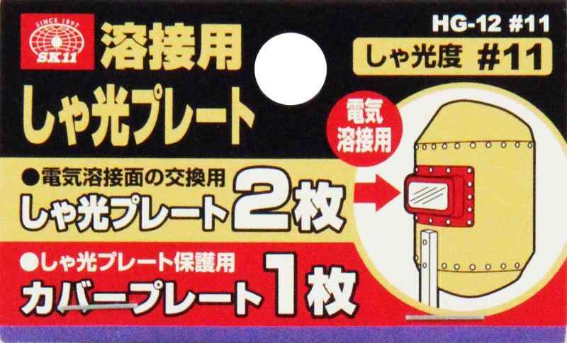 SK11 溶接用しゃ光レンズ 遮光度#11 2枚入 HG-12用途:溶接面(電気溶接)用遮光プレート特徴:溶接時の有害光線やスパッタから目を守るセット内容:遮光レンズ2枚+プラスチックカバーレンズ1枚遮光度:11遮光レンズ:ガラス、カバープレート:プラスチック