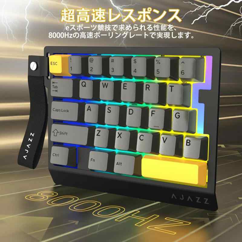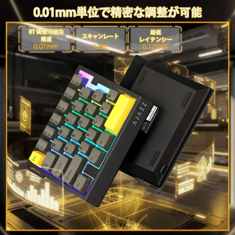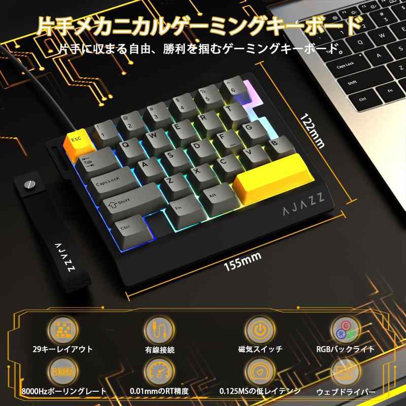 AJAZZ AK029 片手ゲーミングキーボード【業界最高の8000Hzレポートレート】 AK029ゲーミングキーボードは、驚異的な8000Hzのレポートレートと0.125msの超低遅延を実現しました。これは従来の1000Hzキーボードをはるかに凌駕する応答速度であり、あらゆる高速操作や繊細なコマンド入力を完全にサポートします。高主頻のカスタムゲーミングチップと128Kの高速スキャンレートにより、入力信号の損失を完全に排除。FPSでの素早い照準切り替えや、MOBA/RTSでの連続スキル発動など、競技レベルのプレイにおいても、一瞬の遅れもなく、あなたの意のままに操作できます。究極の反応速度で、敵に常に一歩先んじましょう。【革新的な0.01mm RT精度】 AK029片手キーボードは最新技術により、キーの押下深さを0.01mm単位で検知する超高精度のRT機能を搭載。これにより、デッドゾーン(無反応域)は完全になく、急停止やマイクロな操作の精度が飛躍的に向上します。さらに、このキーボードの真髄は、高性能な磁気軸(磁軸)を自由に交換・混在させられる点にあります。お好みやゲームのジャンルに応じて、押下力やアクチュエーションポイントが異なる軸を組み合わせ、独自の最適な設定を構築可能。各軸の特性を最大限に引き出す特調アダプテーションにより、ABA軸の組み合わせでも最高の精度を発揮します。【プレミアムカスタム磁軸】 磁気スイッチキーボードは、電競トーナメント級の手感触と極速応答を実現するために特別に開発された「高級カスタム磁軸」を採用しています。従来のメカニカル軸とは異なる滑らかでクリアな打鍵感は、長時間のゲームプレイにおける疲労を軽減。さらに、底部到達時の心地よいHIFI音は、ゲームへの没入感を大いに高めます。磁軸キーボードでありながら、その音質は非常に純粋で澄んでいます。【世界トップクラスの5層消音構造】 有線キーボード内部は、POサンドイッチ綿、IXPE軸下垫、PETサウンド調整シート、EPDM消音綿、底部シリコンゲルの計5層からなる超高級消音パッケージで完全に充填されています。これは現在世界で最高の構成であり、打鍵時の共鳴や雑音を効果的に吸収・抑制。磁軸の本来の美しい音色を保ちつつ、余計な雑音を排除し、澄み切ったHIFIサウンドを実現します。さらに、頑丈なアルミニウム合金製の定位板がキーのたわみを防ぎ、一貫して安定した入力体験を提供します。【省スペース29キーレイアウト & 多機能ドライバーサポート】 マクロキーボードは、コンパクトな29キー配列と片手設計により、デスクスペースを大幅に節約し、マウスを動かす領域を広く確保。オフィスでのショートカットキーとしても最適です。専用のネットワークドライバーソフトウェアを使用すれば、各キーの機能やマクロ、RGBライティング効果を自由にカスタマイズ可能。個々のプレイスタイルや好みに完全に合わせた設定ができ、真のパーソナライゼーションを実現します。付属のファッショナブルなキャリングストラップで、持ち運びも簡単です。鮮やかなRGBバックライトがゲームの雰囲気を盛り上げます。