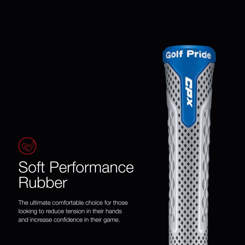 Golf Pride CPx スタンダードグリップ。Golf Prideの最もソフトなパフォーマンスグリップ。EXOのダイヤモンドキルトパターンは、振動を減らし、手の快適さを最大限に引き出します。より大きな下部ハンドでグリップ圧を軽くし、パワーアップ。コアサイズ:60ラウンド重量:52g