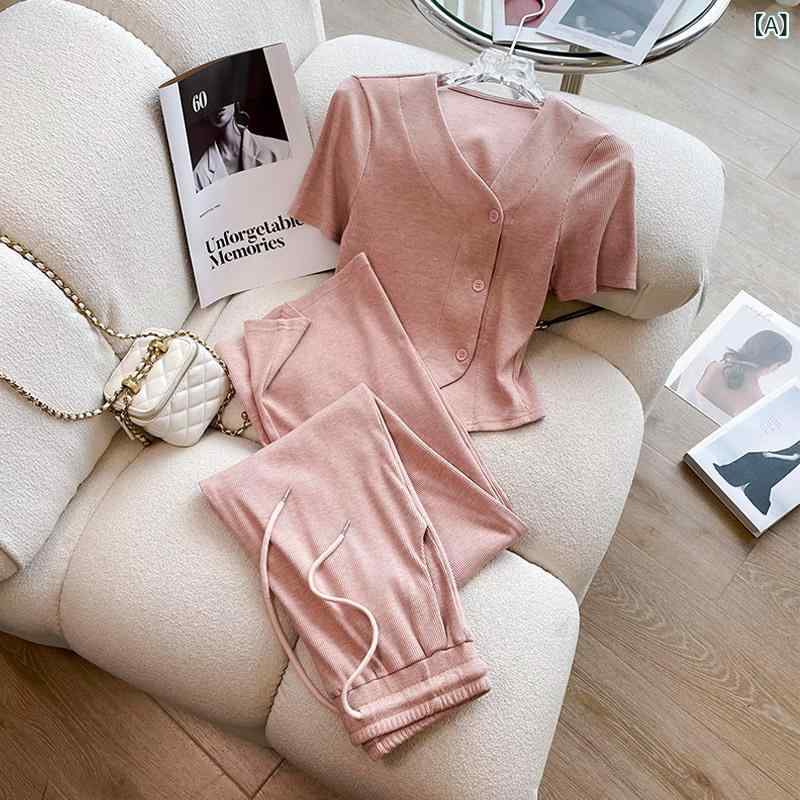 セットアップ レディース 春夏 半袖 Tシャツ へそ出し トップス スタイルアップ カットソー ショート丈 スリムフィット タイトスカート ミニスカート 韓国ファッション・裤长: 长裤・工艺: 拼贴/拼接・面料名称: 棉・主面料成分: 棉・主面料成分2: 涤纶(聚酯纤维)・颜色: 粉色套装・尺码: S,M,L,XL,XXL・风格类型: 清新甜美・风格: 少女风・套装款式: 裤套装・适用性别: 女・袖型: 常规袖・袖长: 三分袖・产品类别: 休闲套装