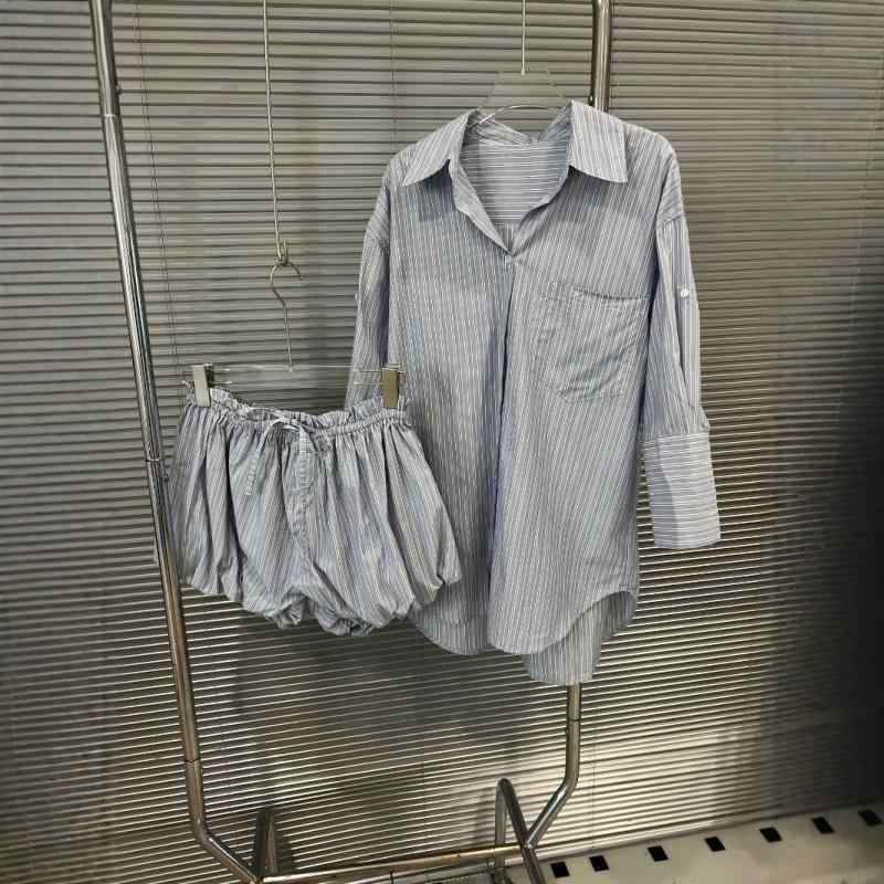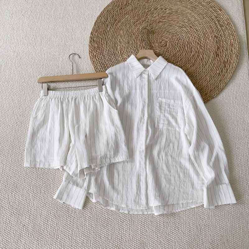 セットアップ レディース 綿麻 ストライプ柄 長袖シャツ ショートパンツ 2点セット リネン混合 普段使い リラックス ルームウェア 春夏