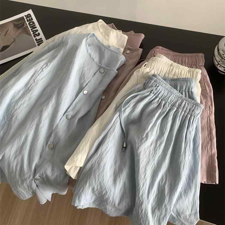 セットアップ レディース 薄手 冷感 長袖 シャツ ショートパンツ 上下セット カジュアル 部屋着 ルームウェア リラックスウェア 接触冷感 涼しい ミント ホワイト ピンク