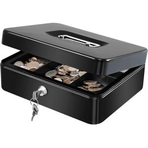 手提げ金庫 キャッシュメイト 会計 オフィス ミニ金庫 貯金箱 スチール製 家庭用(ブラック, W20xD16xH8.8cm)