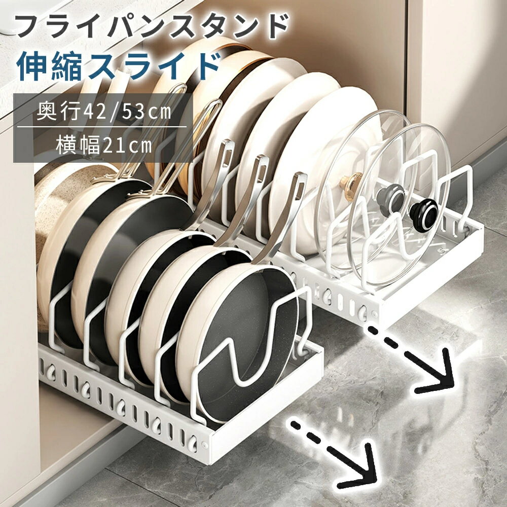 引出し式 フライパンスタンド スライド 伸縮 コンロ下 シンク下 フライパン収納 キッチン収納 鍋 なべ 蓋 立てる収納 調理器具 フライパン置き キッチン 台所 シンク下収納 トレー 持ち手置き 整理 収納上手 整う おしゃれ