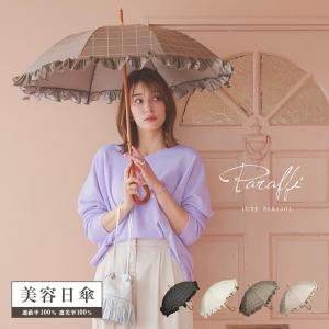 完全遮光 日傘 チェック柄フリルパラソル Paraffi(パラフィ)遮光率100% UV遮蔽率100% 木棒 木製ハンドル ショート傘 紫外線カット UVカット