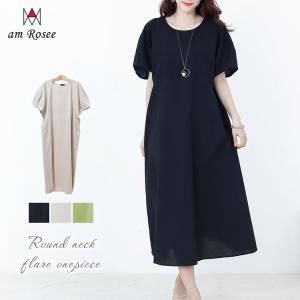 【送料無料】ラウンドネックフレアワンピース◆レディース ワンピース コットン ロング丈 体型カバー 丸首 リラックス カジュアル aライン