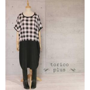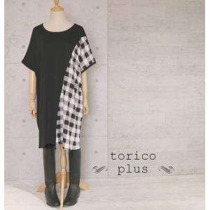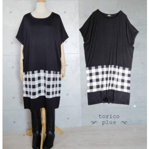 チュニック ワンピース 大きいサイズ Aライン かわいい 春 モノトーン チェック 異素材 配色 ゆったり チュニック 大人 レディース カット ソー