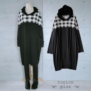 パーカー チュニック ワンピース 長袖 大きいサイズ カットソー トップス ドルマン オーバーサイズ チュニックワンピ 配色 ゆったり フード 黒×チェック