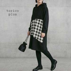 パーカー チュニック ワンピース ゆったり 長袖 大きいサイズ カットソー トップス チュニックワンピ 配色 プルオーバー レディース フード 黒×チェック