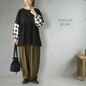 チュニック ボリューム袖 春 ポワン レディース カットソー 40代 50代 かわいい 重ね着 Aライン 大きいサイズ ギャザー 切り替え ワンピー 黒×袖チェック柄