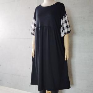 ワンピース チュニック ボリューム袖 春 ポワン レディース カットソー 40代 50代 かわいい ひざ下 Aライン 大きいサイズ ギャザー ワンピー 黒×チェック 5部袖