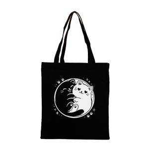 陰陽猫プリント キャンバストートバッグ ブラック カジュアルスタイル 猫好きへのギフトにも最適 BG00039