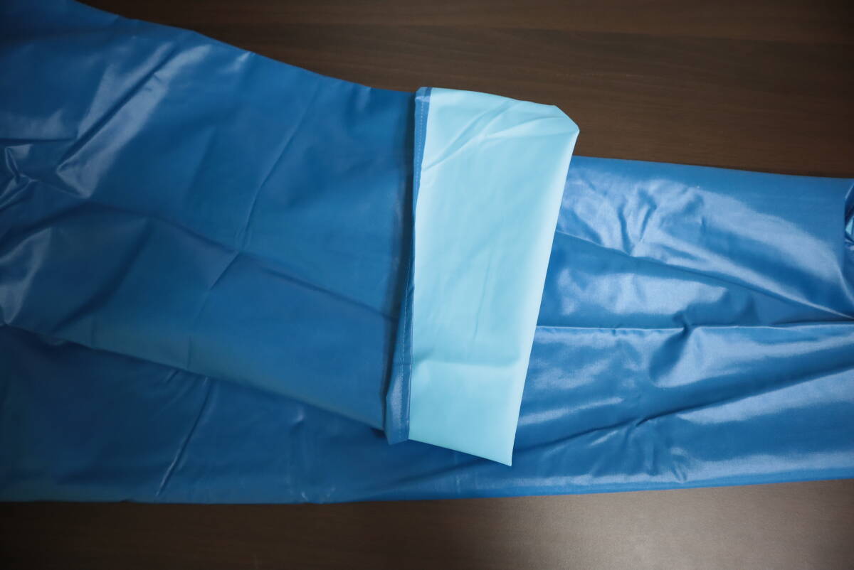 光沢のあるナイロン製、裏ゴム引きです。サイズは110です。色はブルーです。