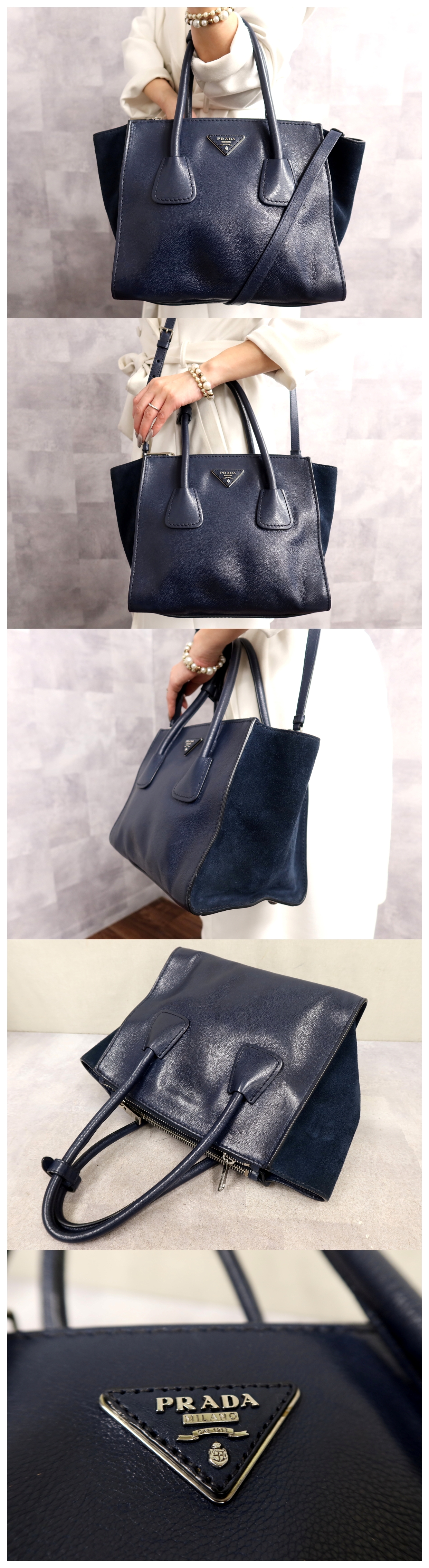 超美品●PRADA プラダ●三角ロゴプレート●スエード カーフ レザー 本革●2way ハンド バッグ●ネイビー●SV金具●イタリア製●B5●Js64859